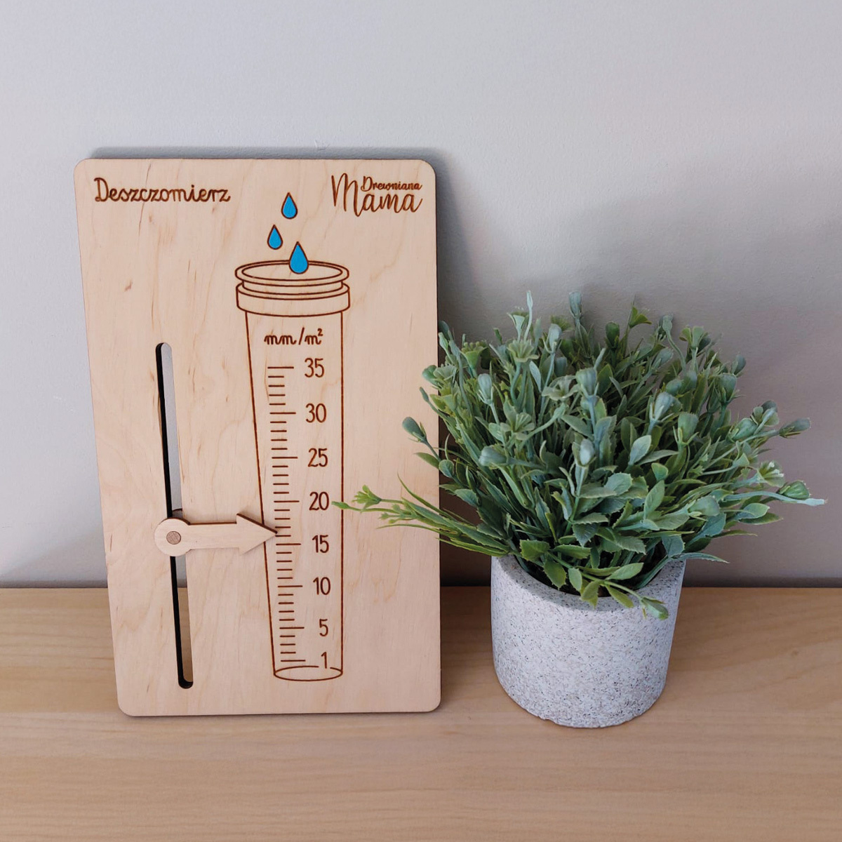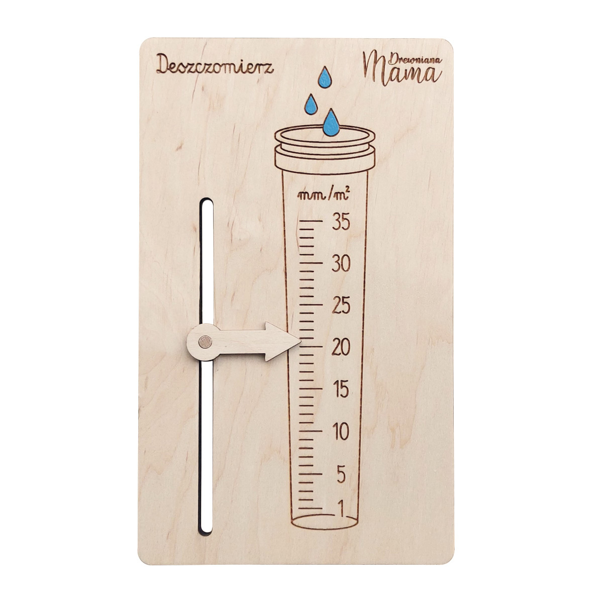 Drewniany Deszczomierz Edukacyjny to praktyczna pomoc edukacyjna wykonana z drewnianej sklejki, dzięki której dzieci uczą się, jak odczytywać i zaznaczać ilość opadów deszczu na skali.