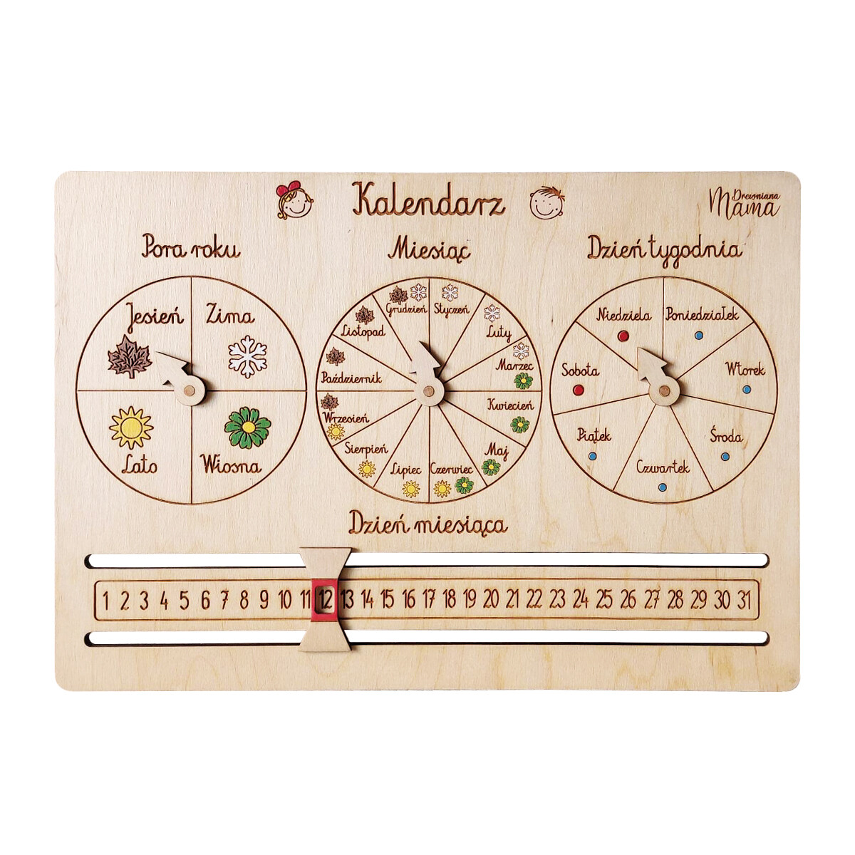 Drewniany kalendarz z dniami miesiąca, który w przejrzysty i prosty sposób pomoże dzieciom zrozumieć upływający czas.