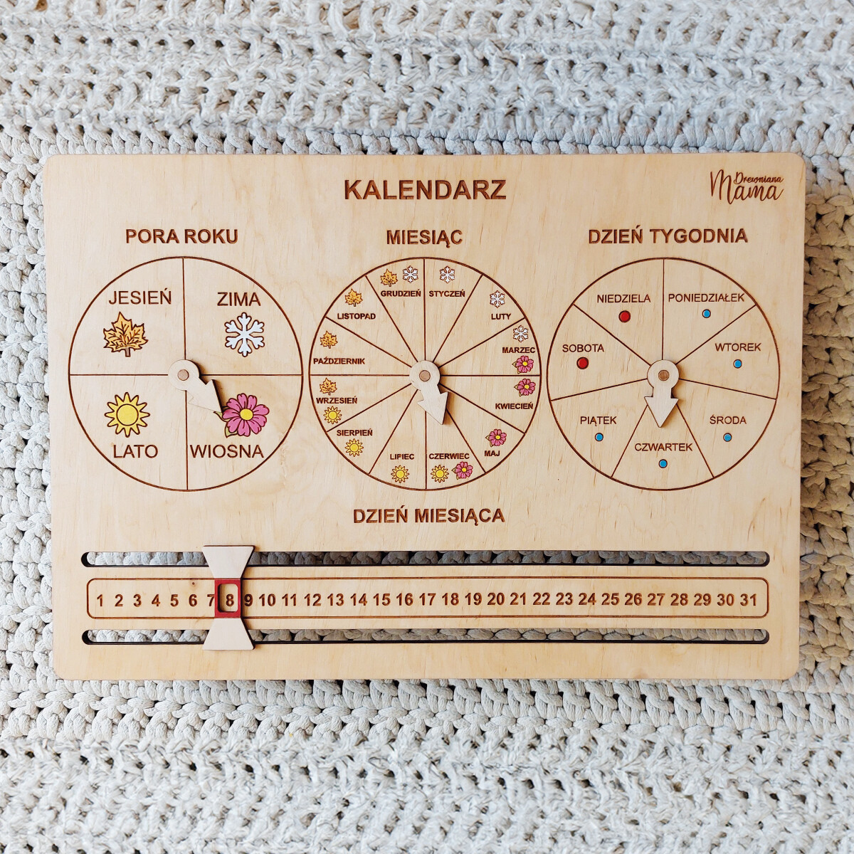 Drewniany kalendarz, który w przejrzysty i prosty sposób pomoże dzieciom zrozumieć upływający czas oraz odkryć zachodzące w przyrodzie zmiany.