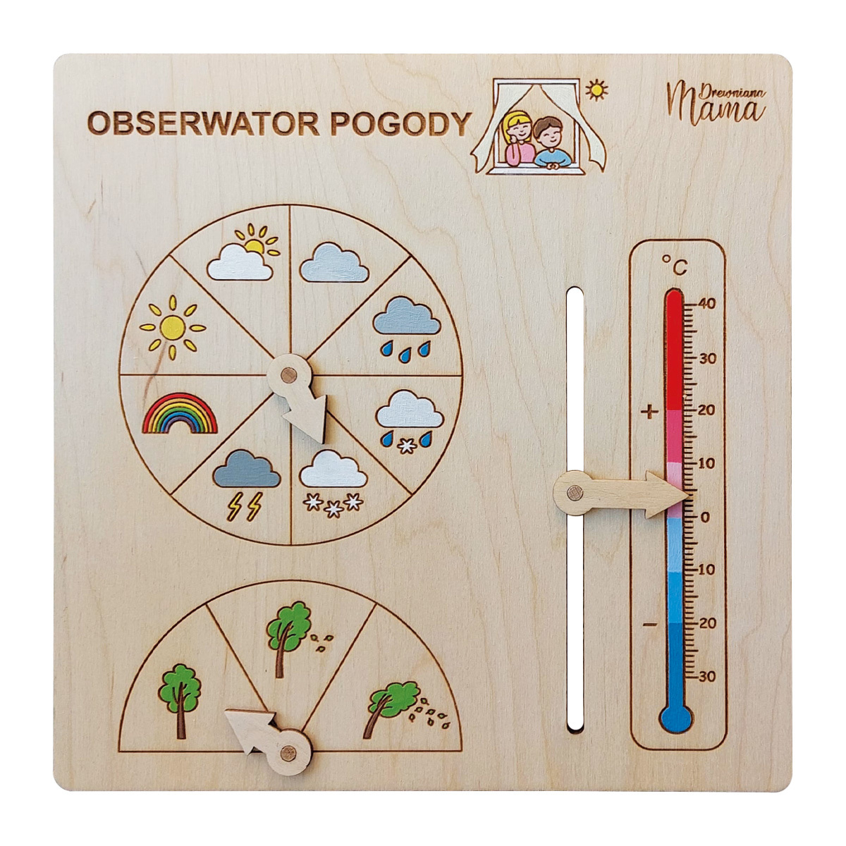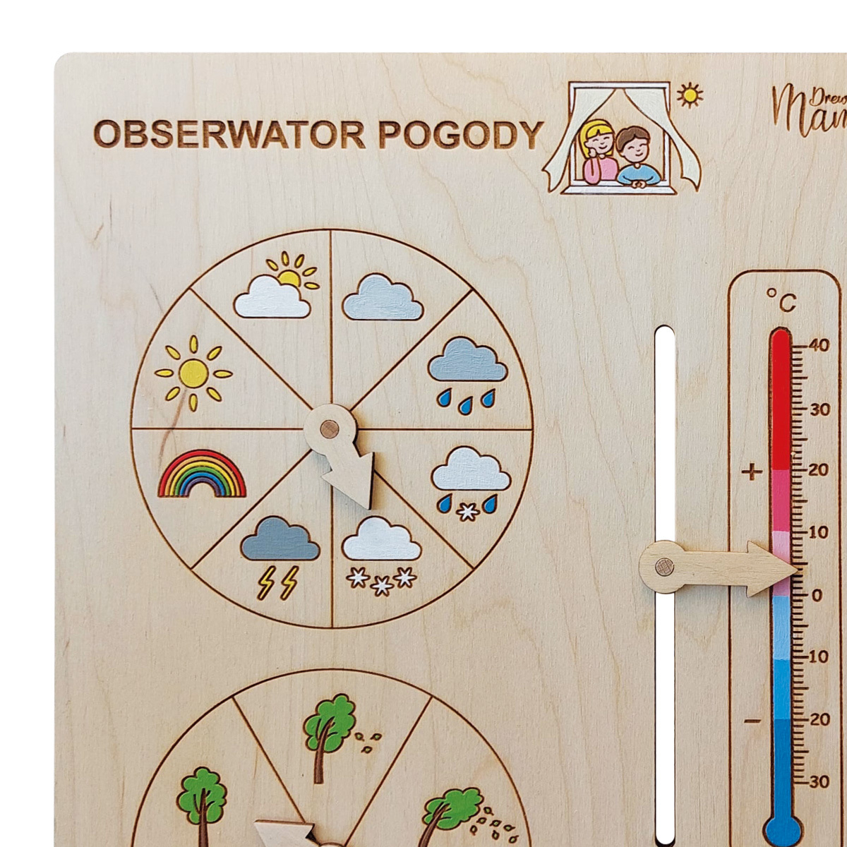 Mały Obserwator Pogody to praktyczna wykonana z drewnianej sklejki tablica, która służy do obserwowania zjawisk atmosferycznych.
